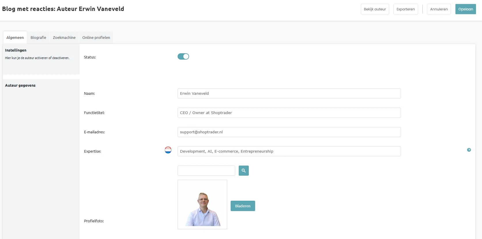 We hebben de Blog Auteur Feature uitgerold. In de backoffice kun je nu per auteur een compleet profiel aanmaken: naam, functietitel, een korte intro, een uitgebreide biografie, expertise-labels, een profielfoto en links naar LinkedIn, X of YouTube.
