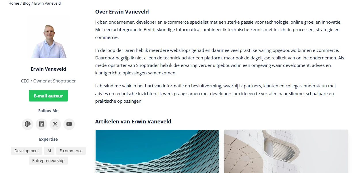 Die informatie verschijnt op twee plekken. Onderaan elke blogpost staat een compacte auteur-box met de intro en een link naar het volledige profiel. Daarnaast krijgt elke auteur een eigen pagina met de volledige bio, alle gepubliceerde artikelen en social-links.